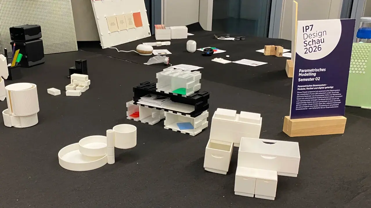 Neben klassischen Modell- und Materialstudien präsentierten Studierende auch Projekte aus dem Bereich des parametrischen Modellierens. Digitale Entwurfs- und Fertigungsmethoden ermöglichen dabei flexible und modulare Lösungen, die funktionale und gestalterische Aspekte verbinden.