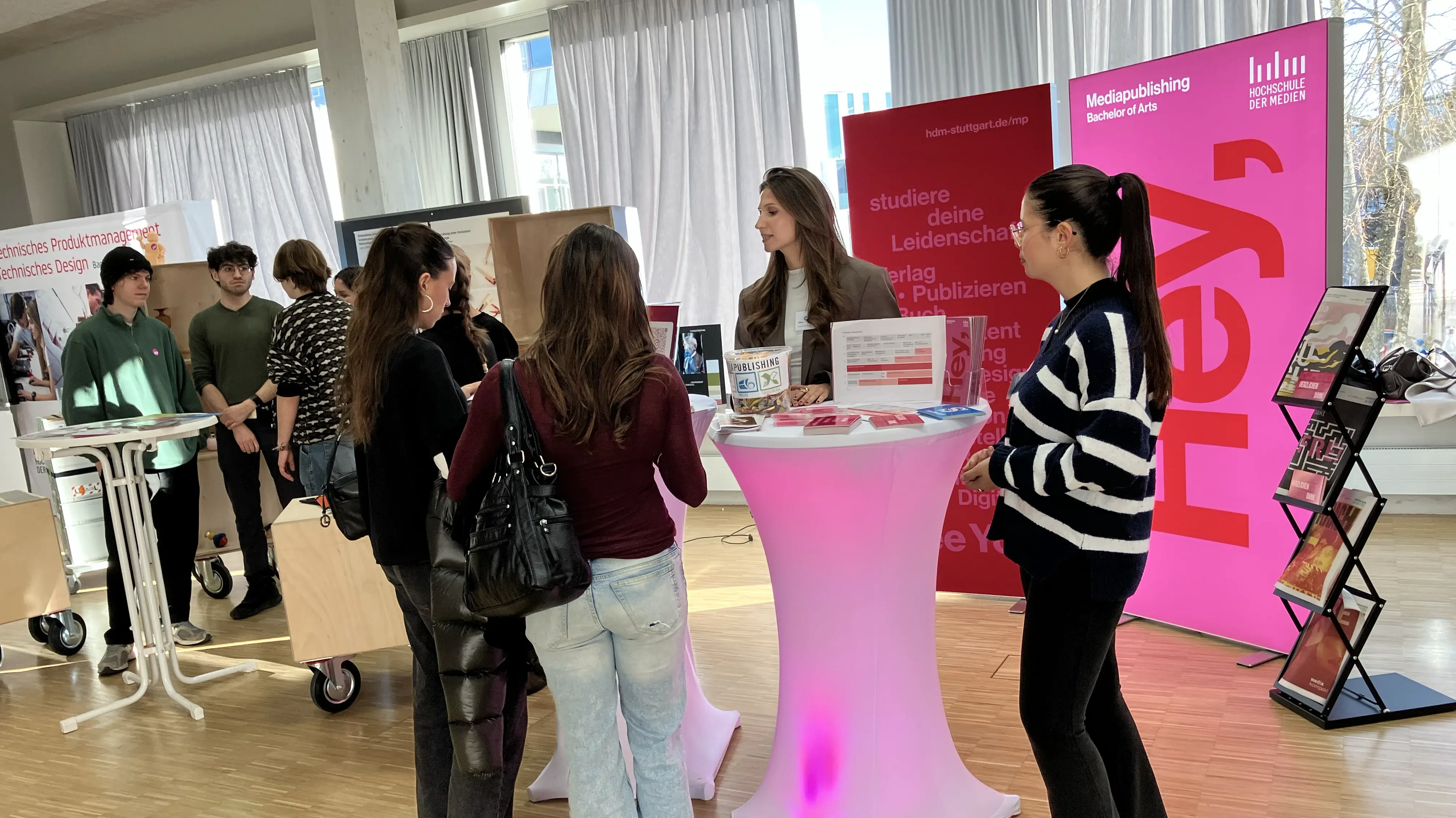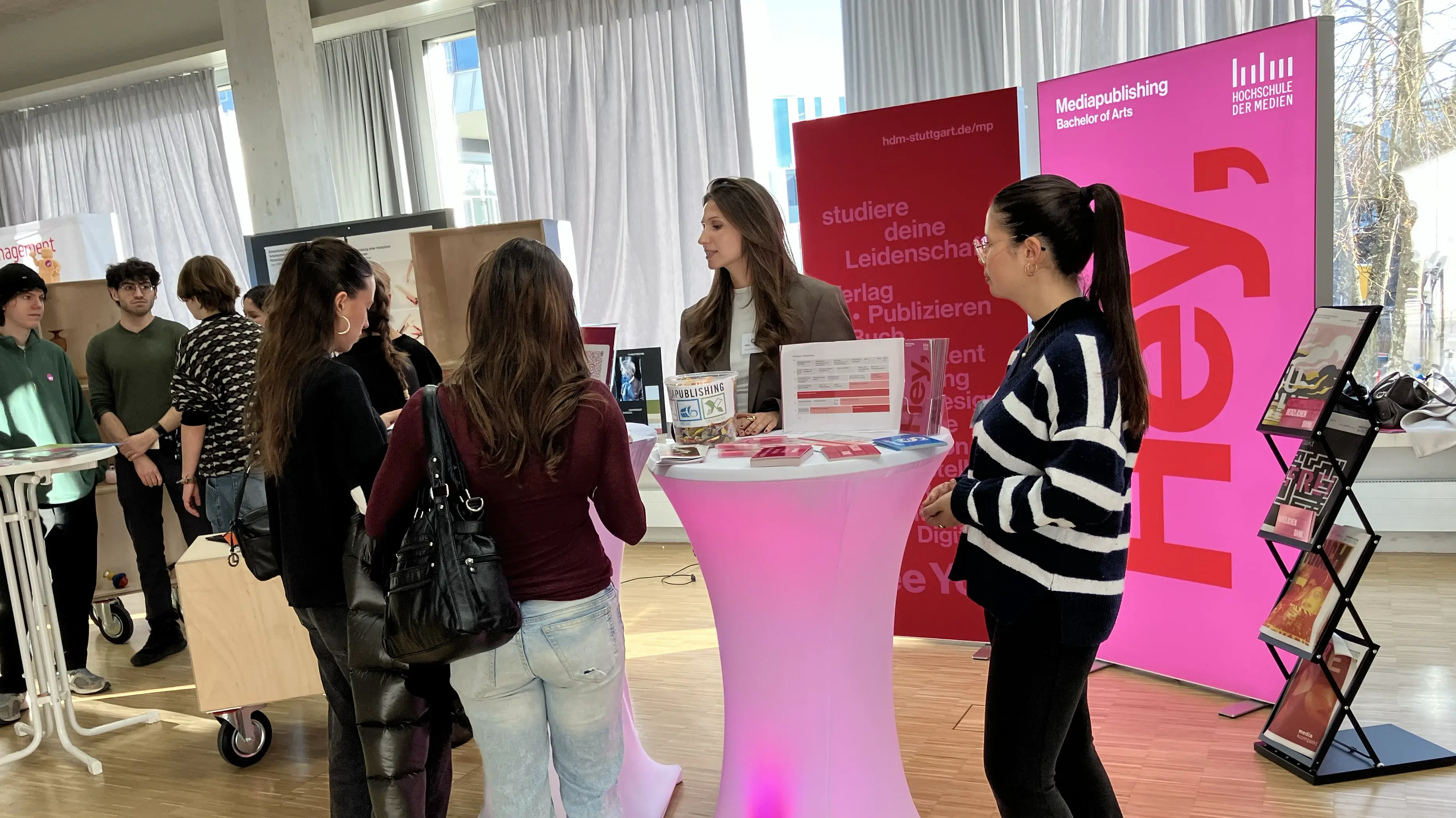 Auch Mediapublishing ist selbstverständlich vertreten: Unsere Studierenden beantworten Ihnen gern alle Fragen rund um das Studium und den Alltag im Verlags- und Medienstudium.