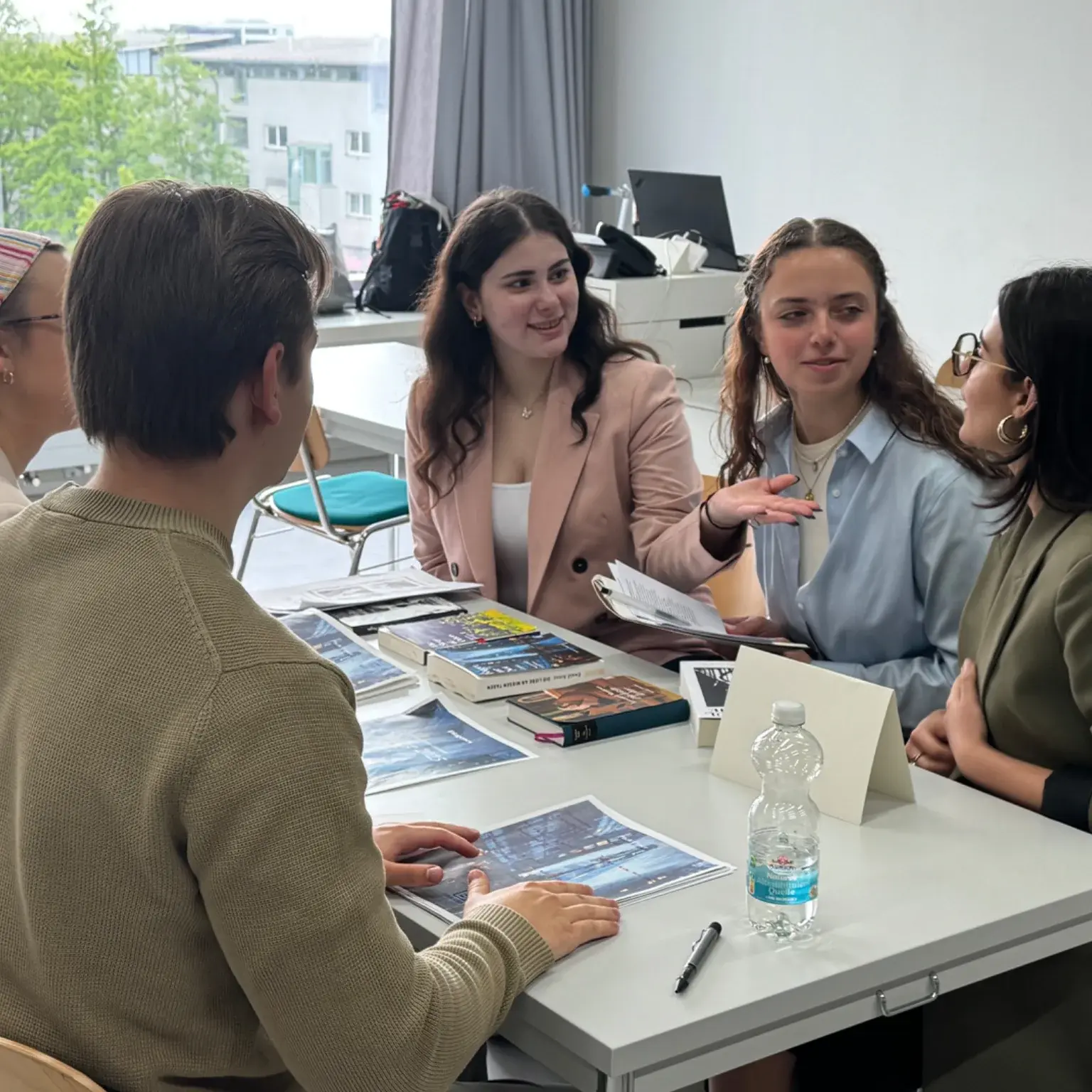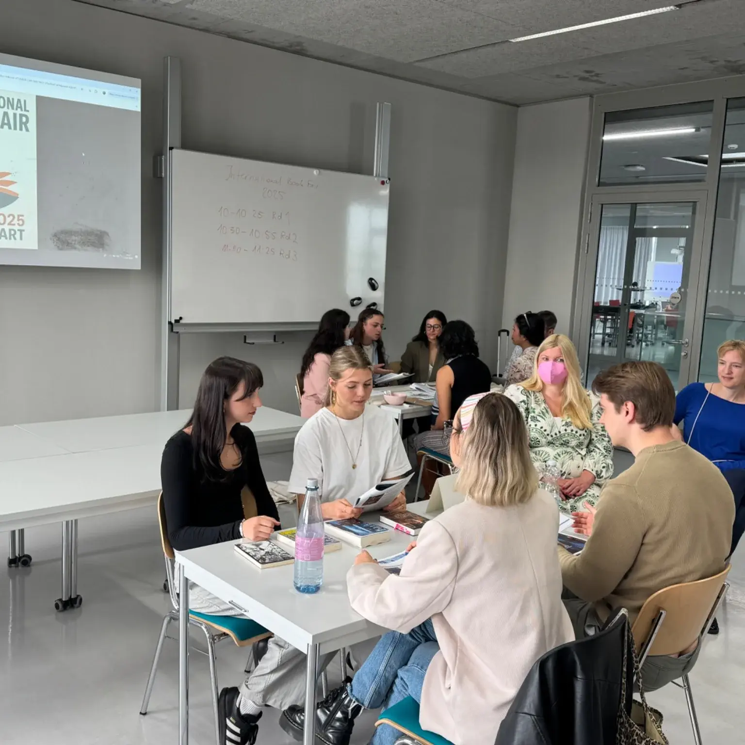 Studierende aus verschiedenen Ländern fanden sich in vier Gruppen zusammen und gründeten innerhalb real existierender Verlagshäuser neue, fiktive Imprints. Ihre Aufgabe: Ein überzeugendes Programm entwickeln, einen Lizenzkatalog erstellen und sich auf der Messe in professionellen Lizenzgesprächen behaupten. Dabei begegneten sich die Gruppen erstmals als "Konkurrent:innen" am Verhandlungstisch – mit klaren Zielsetzungen, aber auch mit Charme, Fingerspitzengefühl und echter Begeisterung.