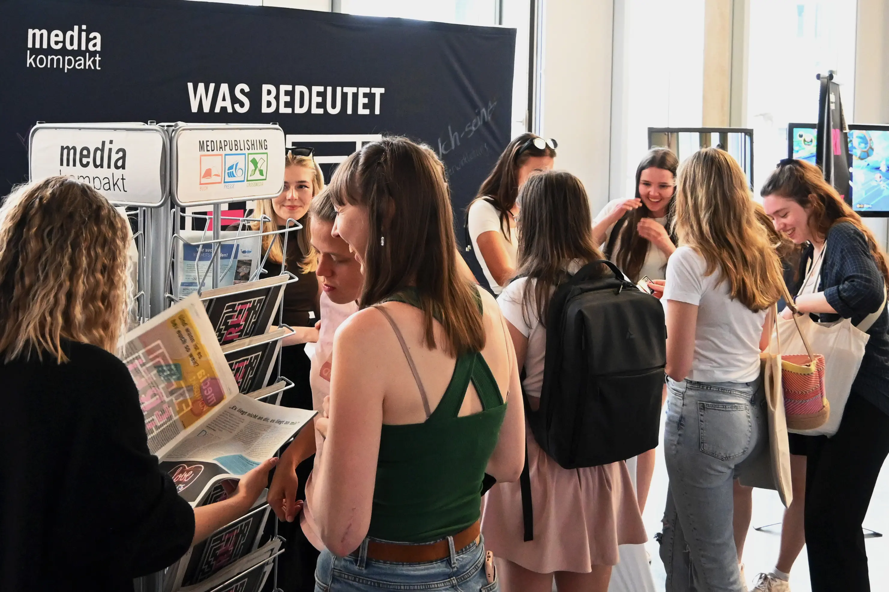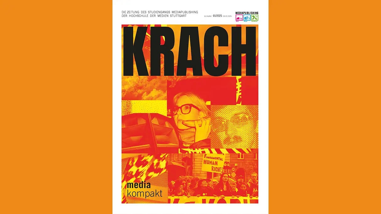Mediakompakt ist die Zeitung des Studiengangs Mediapublishing. Im siebten Semester erwartet die Studierenden ein großes Projekt: Sie kreieren gemeinsam mit zwei erfahrenen Dozentinnen, die direkt aus der Praxis kommen, ihre eigene Zeitung. Die Aufgaben gleichen denen, die auch in der Praxis in einem Zeitungsverlag anfallen. So werden z.B. Anzeigenkunden geworben und es gibt Redaktionssitzungen, in denen Themen und Inhalte besprochen werden. Passend zum gemeinsam gewählten Oberthema dürfen die Studierenden ihren eigenen Artikel recherchieren, begleitendes Bildmaterial aussuchen und das Titelbild gestalten. Anschließend werden die Inhalte in eine Publishing Software eingepflegt. Im letzten Schritt wird Korrektur gelesen, bevor die Zeitung in den Druck geht.