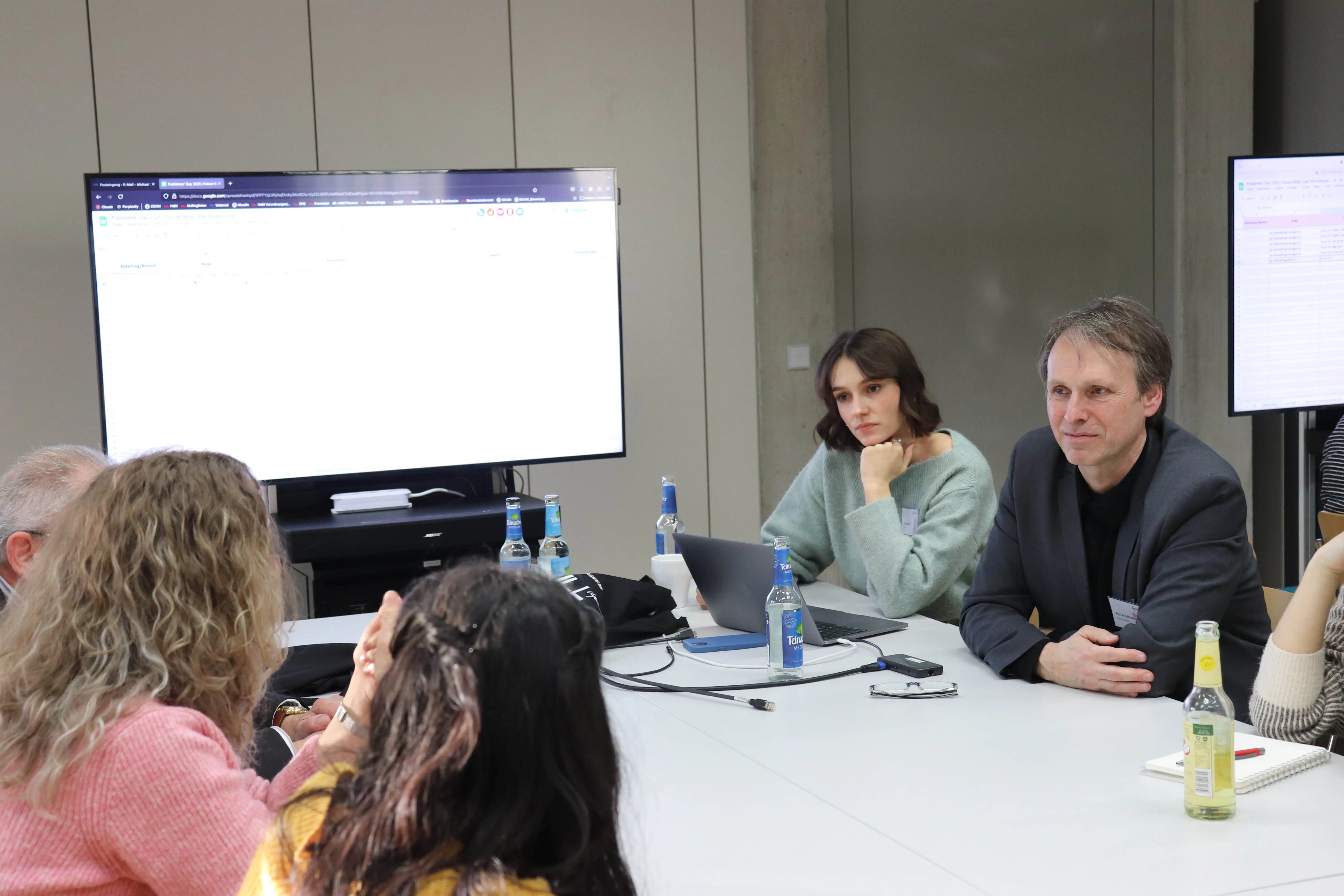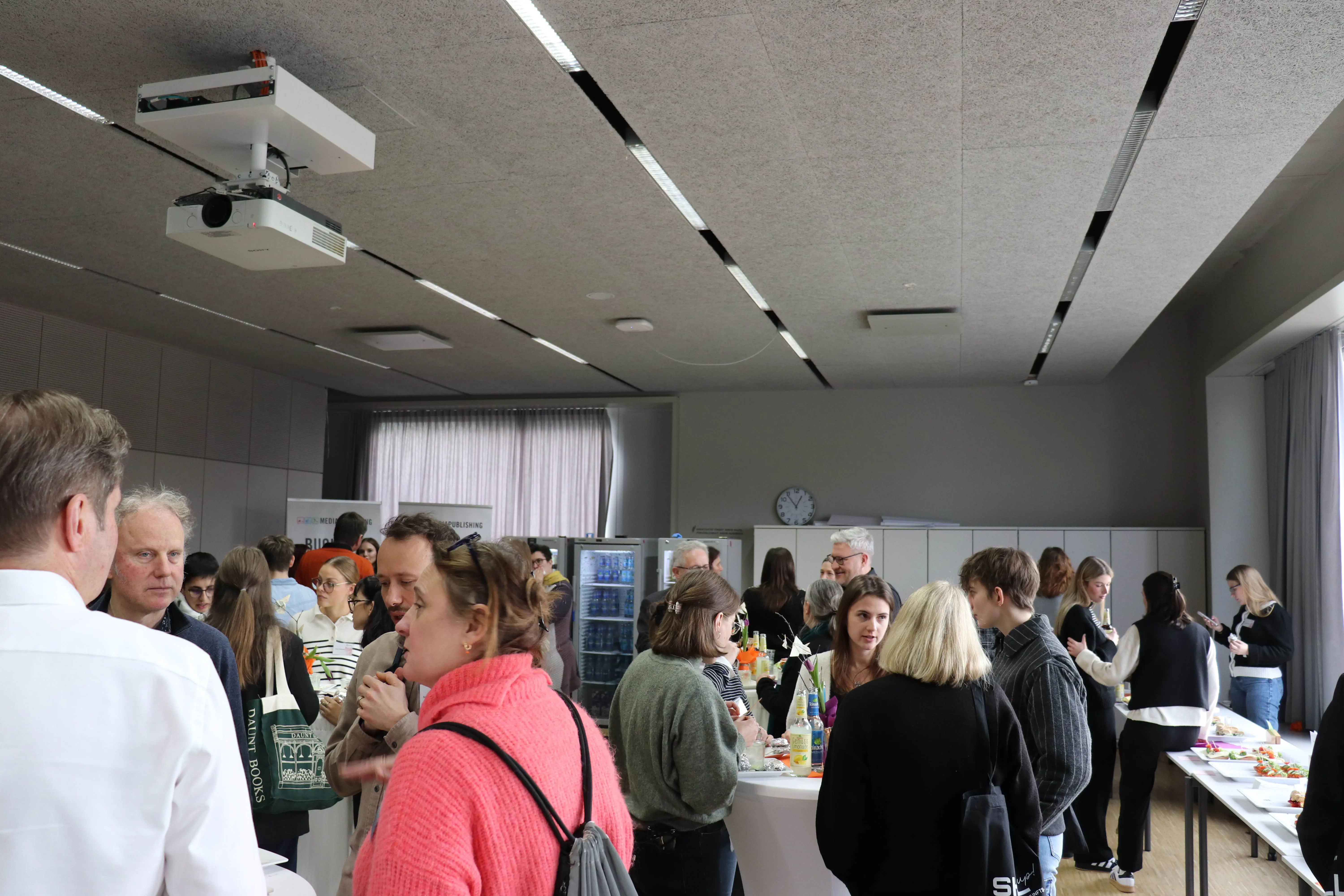 In der Mittagspause konnten sich die Speaker, Workshopleiter:innen und Besucher:innen bei leckeren Snacks und Fingerfood vernetzen und neue Kontakte knüpfen. Für ausreichend Getränke und Kaffee wurde natürlich gesorgt. Anschließend konnten sich in zwei Workshopsrunden die Teilnehmenden an sechs verschiedenen Workshops beteiligen, ihr Wissen austauschen und neue Erkenntnisse gewinnen. Geleitet wurde der Workshop TECHNOLOGIE von Dr. Andreas Falkinger und Prof. Dr. David Klotz. Prof. Dr. Michael Veddern sprach in seinem Workshop über RECHTE & LIZENZEN. Einblicke in den VERTRIEB gab Melanie Michelbrink in ihrem Workshop.Felicia Hofmann und Sabrina Mank gaben in ihrem Workshop MARKETING wertvollen Input. Über das Thema LEKTORAT & PROGRAMMPLANUNG konnte man sich im Workshop von Prof. Dr. Vera Spillner austauschen. Und Michael Kusche hielt einen Workshop über HERSTELLUNG & NACHHALTIGKEIT. Schlussendlich konnte man den Abend mit etwas Sekt und anderen Getränken gemütlich ausklingen lassen und sich mit anderen Teilnehmenr:innen über die gewonnenen Erkenntnisse austauschen.